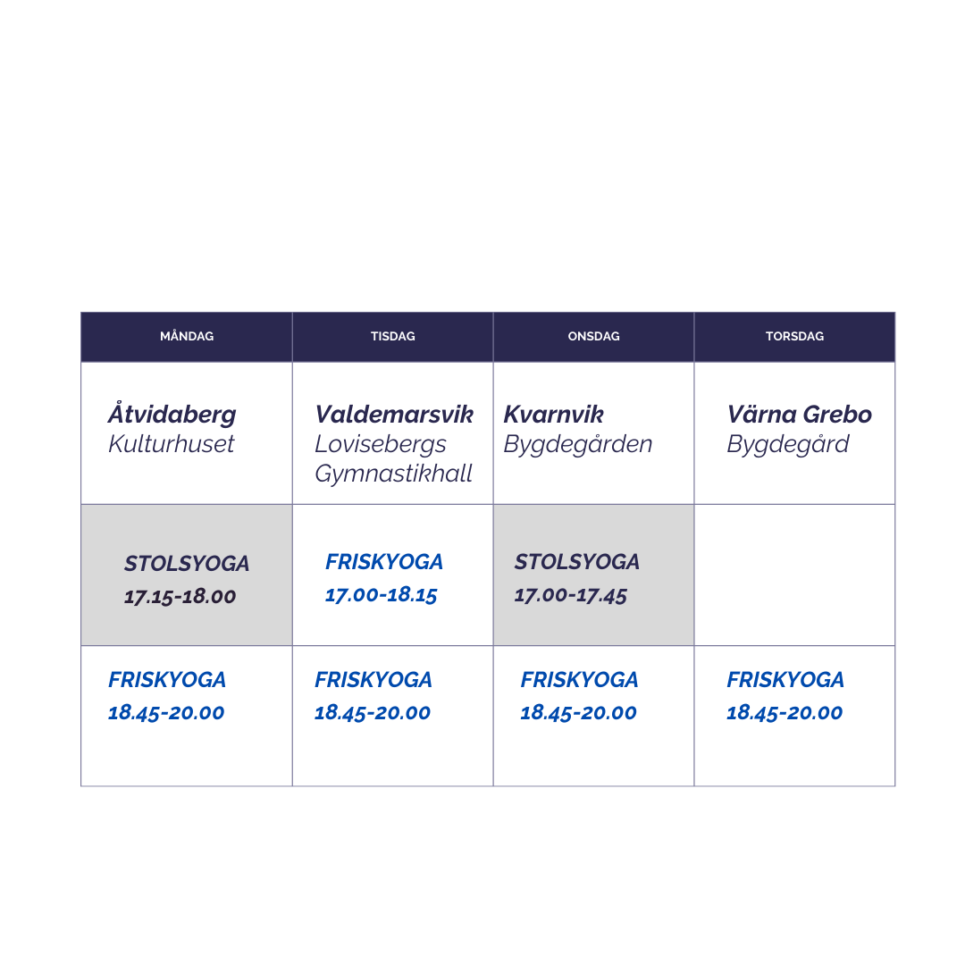 Delta på plats i Åtvidaberg, Valdemarsvik, Kvarnvik och Värna – eller online när det passar dig. Du behöver inte vara vig, trendig eller van – bara lite nyfiken och vilja ta hand om dig själv.